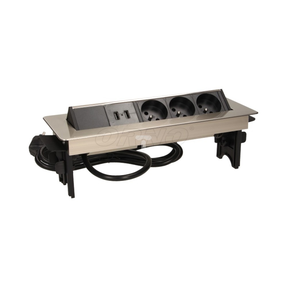 Gniazdo wpuszczane w blat 3x250V w niklowanej obudowie z ładowarką 2xUSB i przewodem 1,8m OR-AE-1364