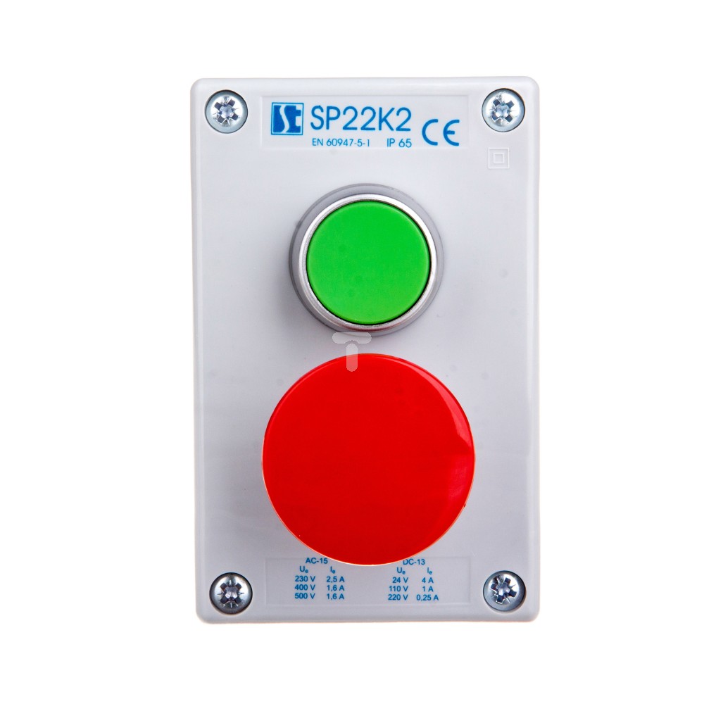 Kaseta sterownicza 2-otworowa zielony/przycisk grzybkowy czerwony 1Z 1R IP65 szara SP22K2\03-2