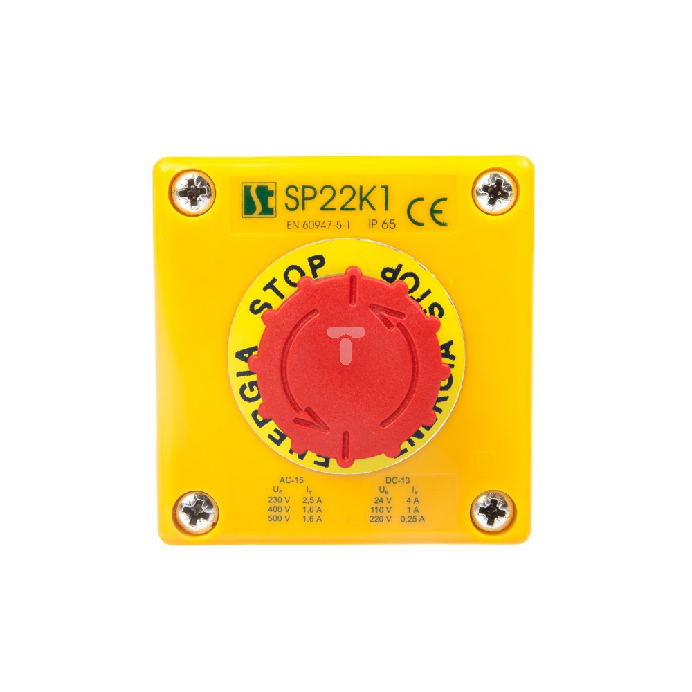 Kaseta sterownicza pochodzi z asortymentu firmy Spamel. Marka produkuje wyroby elektrotechniczne niskiego napięcia, które mają szerokie zastosowanie w przemyśle elektrotechnicznym, maszynowym, a także w energetyce. Kaseta z przyciskiem bezpieczeństwa pochodzi z serii SP22, która cechuje się łatwym tworzeniem potrzebnych wariantów praktycznych przycisków, a także umożliwia wprowadzanie zmian w istniejących obwodach sterowniczych. Produkt jest przeznaczony do załączania lub rozłączania prądów o natężeniu do 2,5 A poprzez obrót przycisku grzybkowego o 180 stopni. Swoje zastosowanie znajdzie w sygnalizacji świetlnej oraz dźwiękowej, w pulpitach maszyn, jak i w szafach sterowniczych. Kaseta posiada przycisk z guzikiem grzybkowym bezpieczeństwa B, który rygluje się samoczynnie. Kaseta jest wykonana z tworzywa sztucznego i posiada stopień ochrony IP65. Dostępna jest w kolorze żółtym, z czerwonym przyciskiem. Na kasecie jest również umieszczona aluminiowa tabliczka informująca o przeznaczeniu urządzenia. Produkt stosuje się w zakładach produkcyjncyh oraz w branży budowlanej.