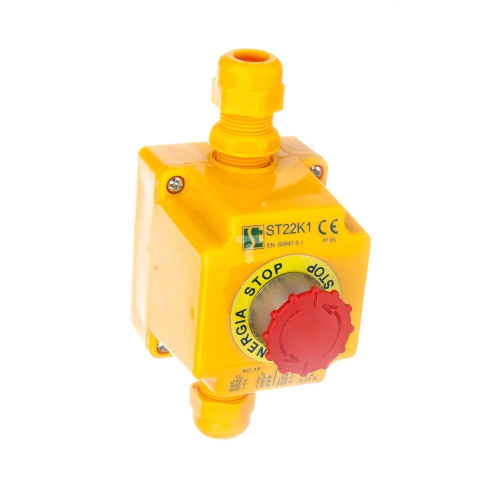 Kaseta z przyciskiem bezpieczeństwa przez obrót 1R IP65 żółta 2x dławnica M20 ST22K1\05-2