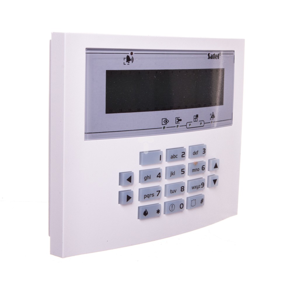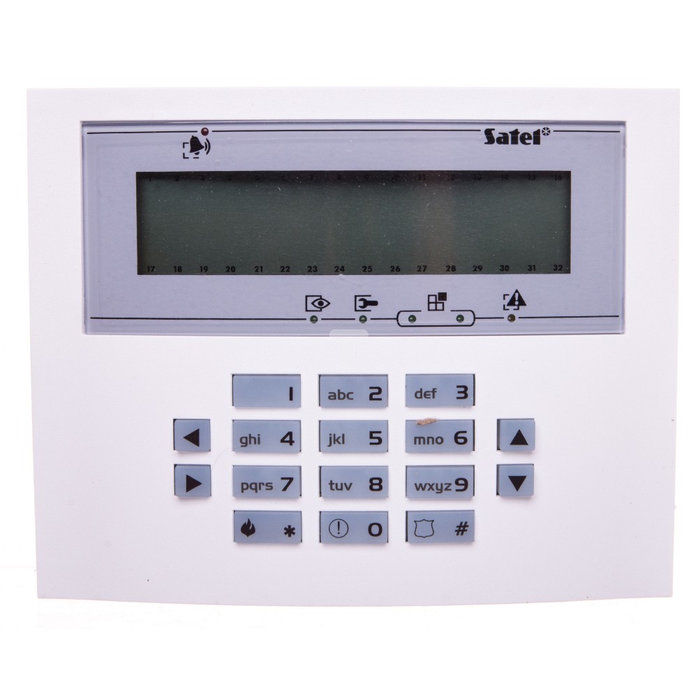Klawiatura obsługi systemu alarmowego, LCD, 2 wejścia, wersja L, niebieskie podświetlanie, do systemu Integra, Satel INTLCDLBL, sygnalizacja utraty łączności z centralą, łącze RS–232 do współpracy z programem GUARDX