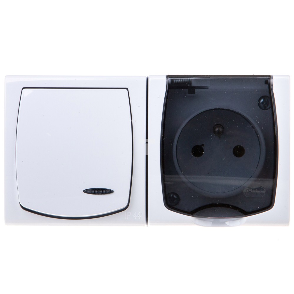MADERA Łącznik hermetyczny jednobiegunowy z podświetleniem + gniazdo pojedyncze z/u z klapką przezroczystą biały ZH-NŁ1SG/00/d