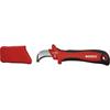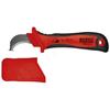 Nóż monterski NMZS 50 Nóż monterski ze stopką i izolowaną rękojeścią do pracy pod napięciem 1000V. - ergonomiczna dwukomponentowa rękojeść - nieosłonięte ostrze ze stali nierdzewnej zakończone stopką ułatwiające odizolowywanie przewodów - dodatkowe ostrze na przedniej części noża pozwalające na rozcinanie przewodów w dwie strony - kaptur ochronny na ostrze - długość ostrza: 50 mm - długość noża: 200 mm