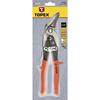 Nożyce do blachy lewe TOPEX (nr ref. 01A430) o długości 240 mm służą do przecinania blachy o grubości do 1.5 mm. Wykonane ze stali chromowo-wanadowej. Gumowe nakładki na rękojeść są właściwie wyprofilowane i bardzo dobrze obsadzone, co zapewnia stabilność i komfort pracy. Wyposażone w otwór na końcu rękojeści, pozwalający na przymocowanie zawieszki. Ostre krawędzie szczęk lekko i płynnie przecinają blachę. Marka TOPEX skierowana jest do majsterkowiczów.