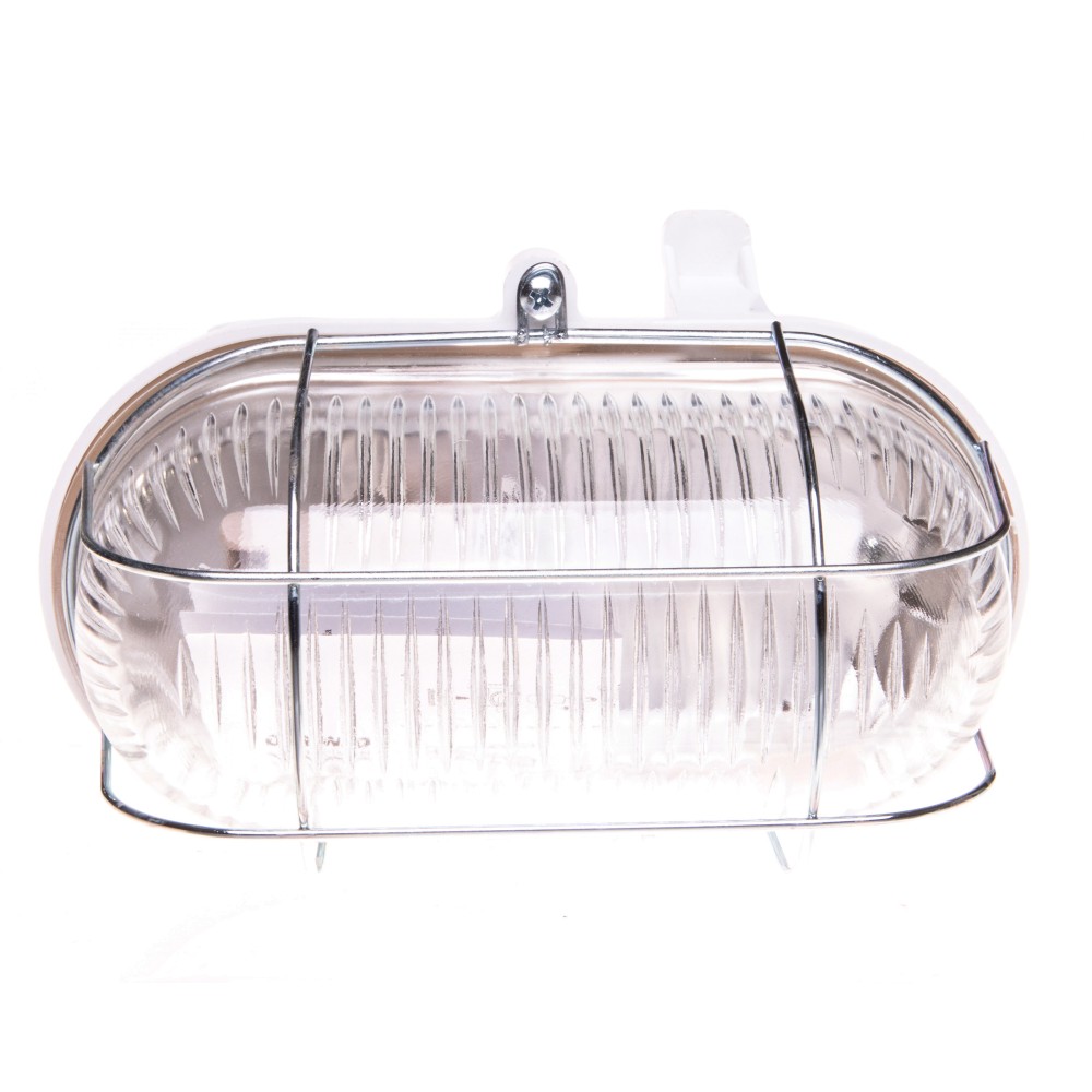 Oprawa owalna duża, przeznaczona do oświetlania wewnętrznych i zewnętrznych części pomieszczeń, takich jak klatki schodowe, korytarze, piwnice, garaże, magazyny, pomieszczenia gospodarcze, oświetlenie na zewnątrz budynku, sauny, chłodnie itp. Dzięki podstawie bakelitowej i szklanemu kloszowi oprawa jest odporna na maksymalnie niskie i ekstremalnie wysokie temperatury.Materiał jakiego użyto przy produkcji obudowy to tworzywo sztuczne w kolorze białym. Klosz jest wykonany z przezroczystego szkła.