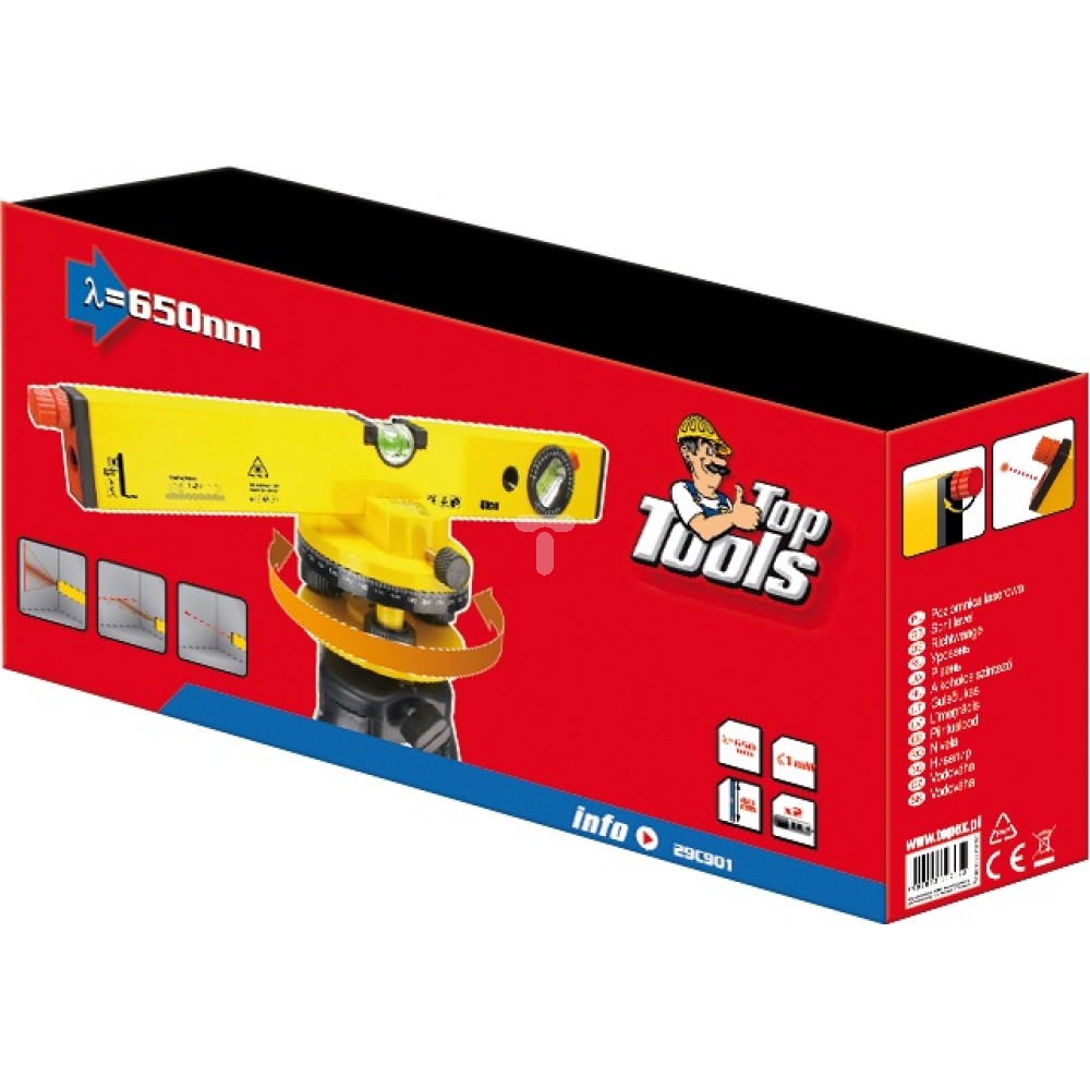 Poziomnica laserowa 40 cm Top Tools (nr ref. 29C901) zapakowa jest w walizkę z tworzywa aby ułatwić przechowywanie i transport. W zestawie znajduje się także aluminiowy statyw z regulacją poziomu wysokości w zakresie 50cm95cm oraz baterie 2xAAA. Poziomnice wyposażono w obrotową podstawę niwelującą która umożliwia wyznaczenie płaszczyzny poziomej 360 stopni.