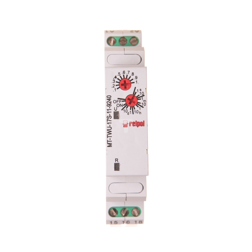 Przekaźnik czasowy – jednofunkcyjny, funkcja Wu-załączenie na nastawiony czas, ON/OFF - stałe załączenie/wyłączenie 8 zakresów czasowych, Napięcie zasilania - uniwersalne: 12...240VAC/DC 50/60 Hz