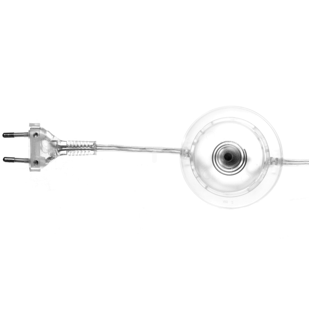 Przewód H03VVH2-F 2 x 0,75 mm2, o długości 300 cm,płaska wtyczka i łącznik nożny 2,5 A / 250 V AC z tworzywa sztucznego zamontowany 50 cm od końca przewodu.Opakowanie: woreczek z zawieszką. Kolor bezbarwny.