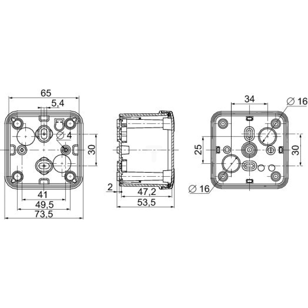 Puszka ABS IP66 IK07 RAL7035 wewW65 S65 G45 zewW74 S74 G56 nieprzezr.pokrywa W10. rodzina produktów: Thalassa TBS - aplikacja urządzenia: wielozadaniowy - wysokość: 74 mm - szerokość: 74 mm - głębokość: 54 mm - wysokość wewnętrzna: 65 mm - szerokość wewnętrzna: 65 mm - głębokość wewnętrzna: 47 mm - montaż obudowy: montowane na ścianie - składanie urządzenia: 1 x korpus, 1 x pokrywa, 4 x śruba pokrywy - liczba na zestaw: zestaw 5 szt. - typ korpusu: jednoczęściowa formowana - rodzaj osłony czołow