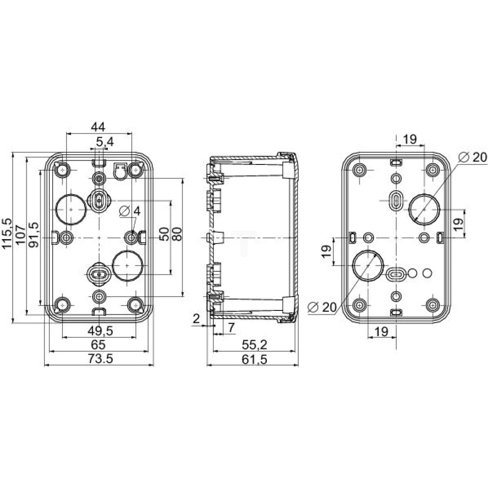 Puszka PC IP66 IK08 RAL7035 wewW105 S65 G55 zewW116 S74 G62 nieprzezr. pokr. W10. rodzina produktów: Thalassa TBP - aplikacja urządzenia: wielozadaniowy - wysokość: 116 mm - szerokość: 74 mm - głębokość: 62 mm - wysokość wewnętrzna: 105 mm - szerokość wewnętrzna: 65 mm - głębokość wewnętrzna: 55 mm - montaż obudowy: montowane na ścianie - składanie urządzenia: 1 x korpus, 1 x pokrywa, 4 x śruba pokrywy - liczba na zestaw: zestaw 5 szt. - typ korpusu: jednoczęściowa formowana - rodzaj osłony czołowej: niska pełna pokrywa - mocowanie pokrywy: śruby metalowe. Zalety: .. Zastosowanie: ..