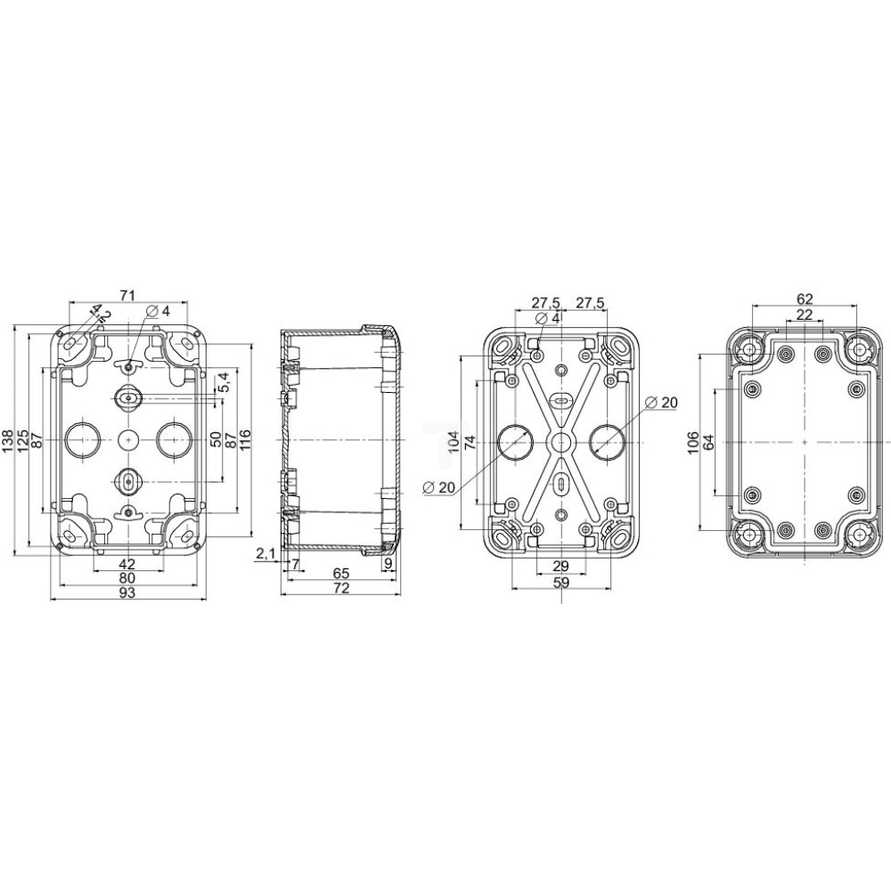 Puszka PC IP66 IK08 RAL7035 wewW125 S80 G65 zewW138 S93 G72 nieprzezr. pokr. W20. rodzina produktów: Thalassa TBP - aplikacja urządzenia: wielozadaniowy - wysokość: 138 mm - szerokość: 93 mm - głębokość: 72 mm - wysokość wewnętrzna: 125 mm - szerokość wewnętrzna: 80 mm - głębokość wewnętrzna: 65 mm - montaż obudowy: montowane na ścianie - składanie urządzenia: 1 x korpus, 1 x pokrywa, 4 x śruba pokrywy - liczba na zestaw: zestaw 2 szt. - typ korpusu: jednoczęściowa formowana - rodzaj osłony czoł