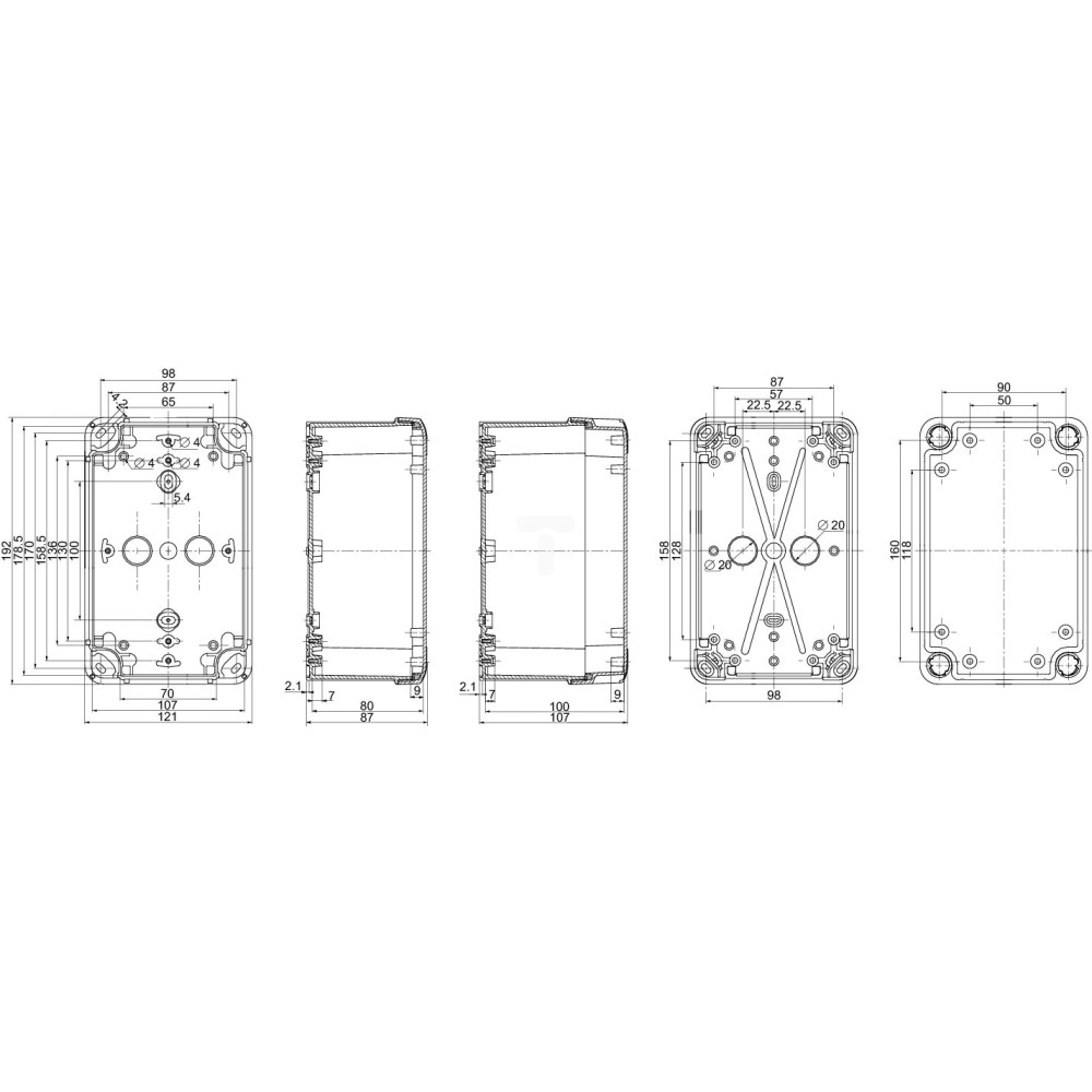 PuszkaPC IP66IK08 RAL7035 wewW175 S105 G80 zewW192 S121 G87nieprzezr. pokr. S20. rodzina produktów: Thalassa TBP - aplikacja urządzenia: wielozadaniowy - wysokość: 192 mm - szerokość: 121 mm - głębokość: 87 mm - wysokość wewnętrzna: 175 mm - szerokość wewnętrzna: 105 mm - głębokość wewnętrzna: 80 mm - montaż obudowy: montowane na ścianie - składanie urządzenia: 1 x korpus, 1 x pokrywa, 4 x śruba pokrywy - liczba na zestaw: zestaw 2 szt. - typ korpusu: jednoczęściowa formowana - rodzaj osłony czołowej: niska pełna pokrywa - mocowanie pokrywy: śruby plastikowe. Zalety: .. Zastosowanie: ..