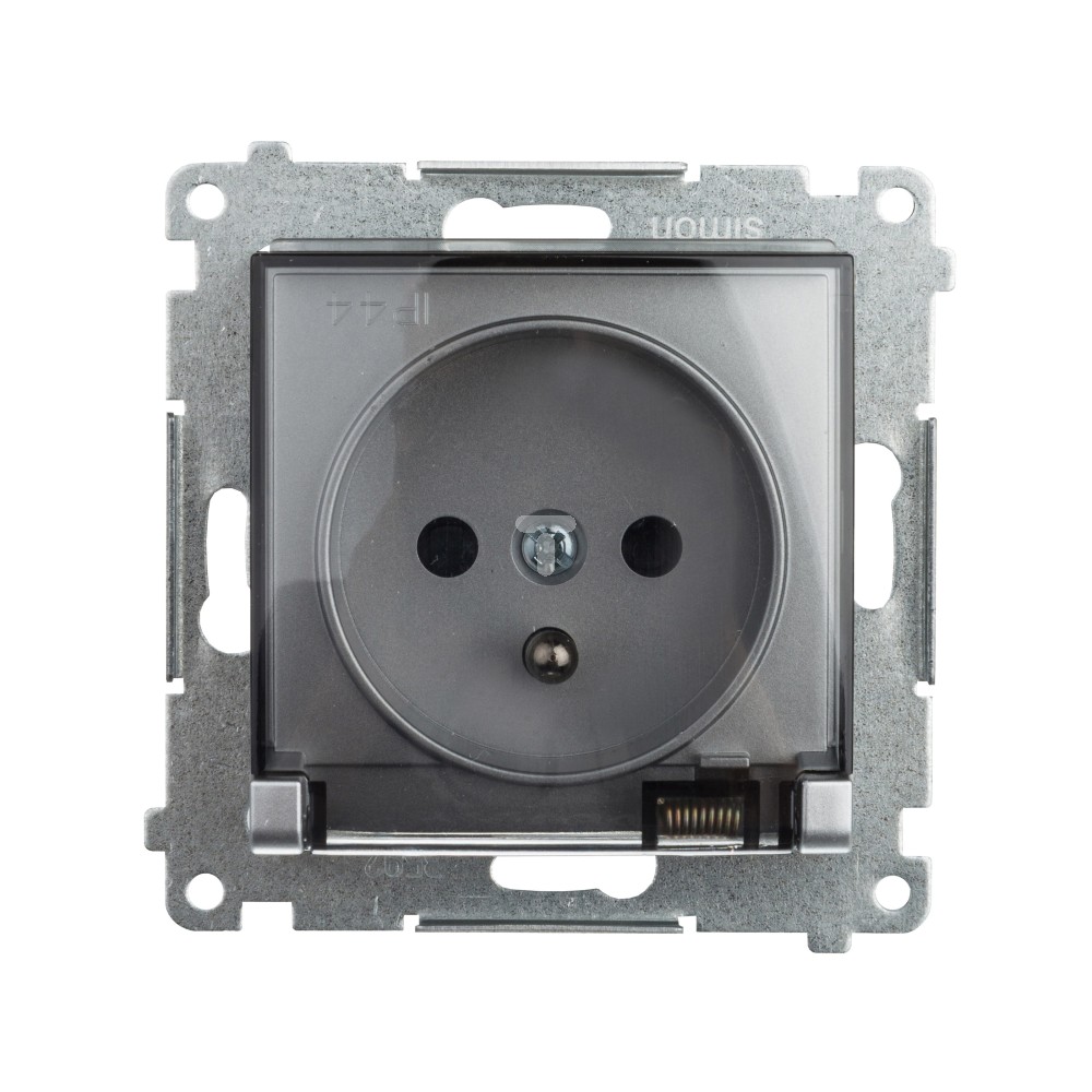 Simon 54 Gniazdo hermetyczne pojedyncze z/u 16A IP44 z klapką transparentną bez uszczelki srebrny mat DGZ1BUZ.01/43A