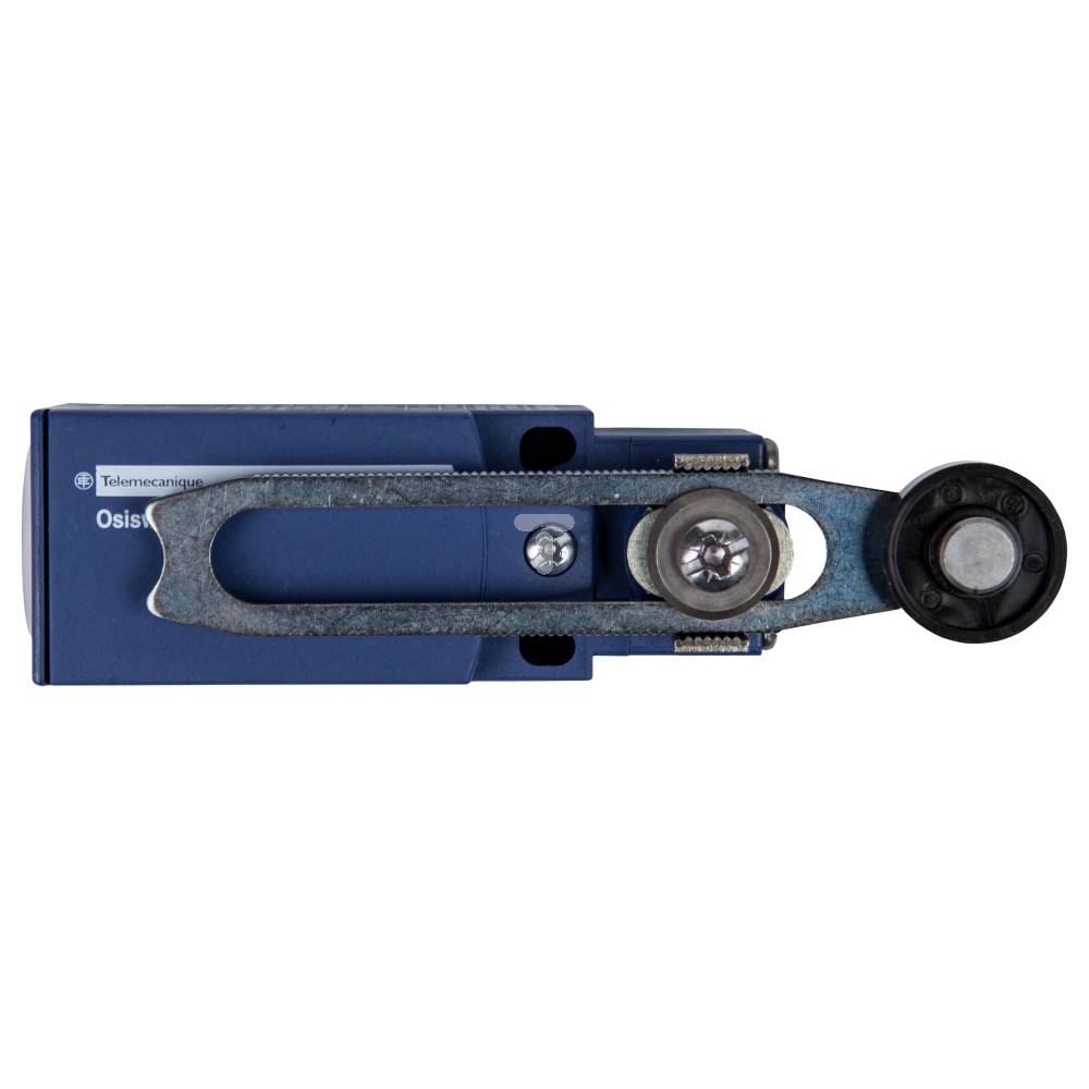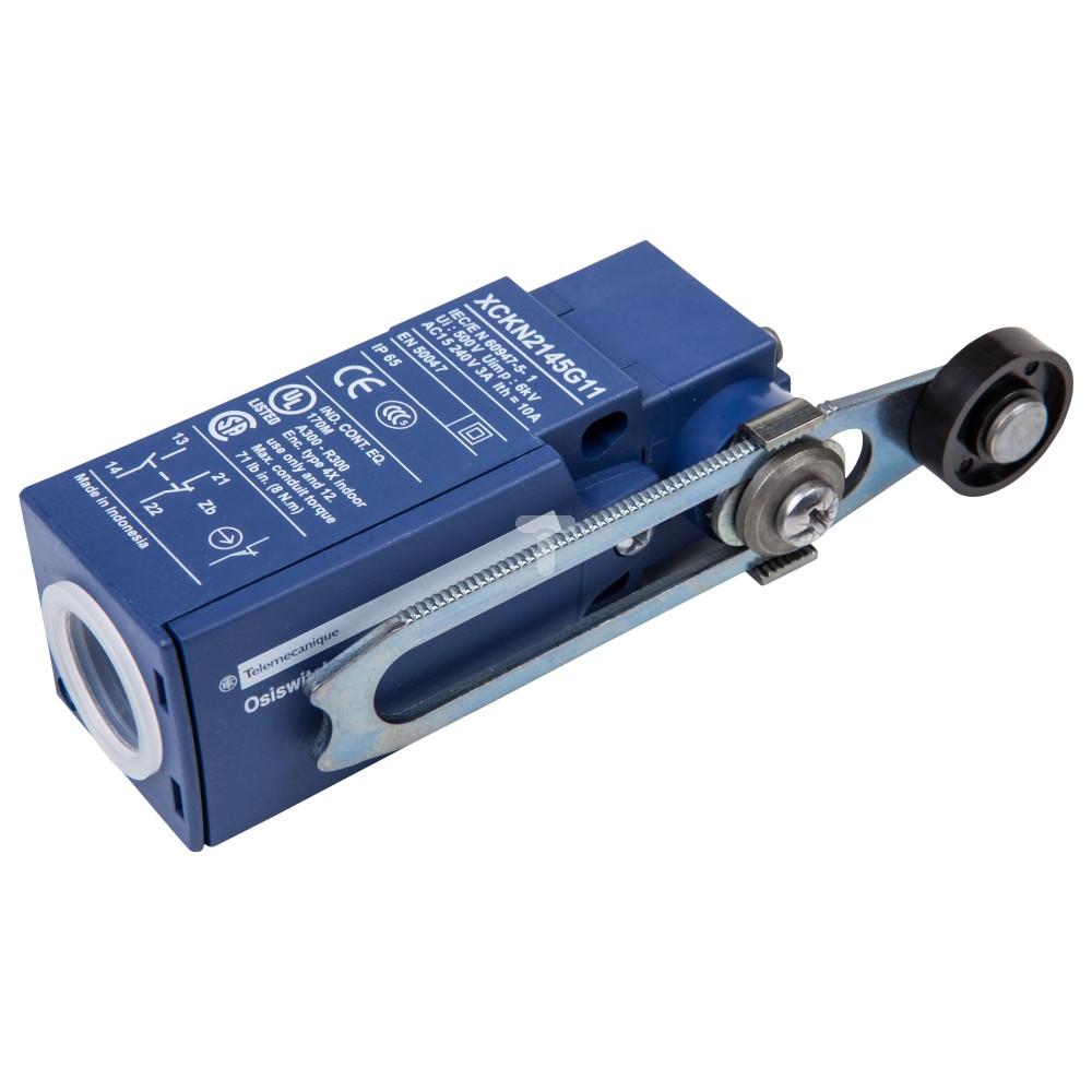 Powyższy wyłącznik krańcowy został wytworzony w serii OsiSense XC. Urządzenie posiada dźwignię obrotową z regulacją długości. Wyprodukowano go z tworzywa sztucznego w kształcie prostopadłościanu. Wyłącznik posiada po jednym styku zwiernym i jednym rozwiernym. Wbudowano również styk migowy. Długość czujnika wynosi 30 mm, szerokość również 30 mm, a wysokość 65 mm. IP65, mówi iż aparat może być używany na zewnątrz w warunkach trudnych, takich jak deszcz, śnieg itp. Do obwodu urządzenie podłączymy p