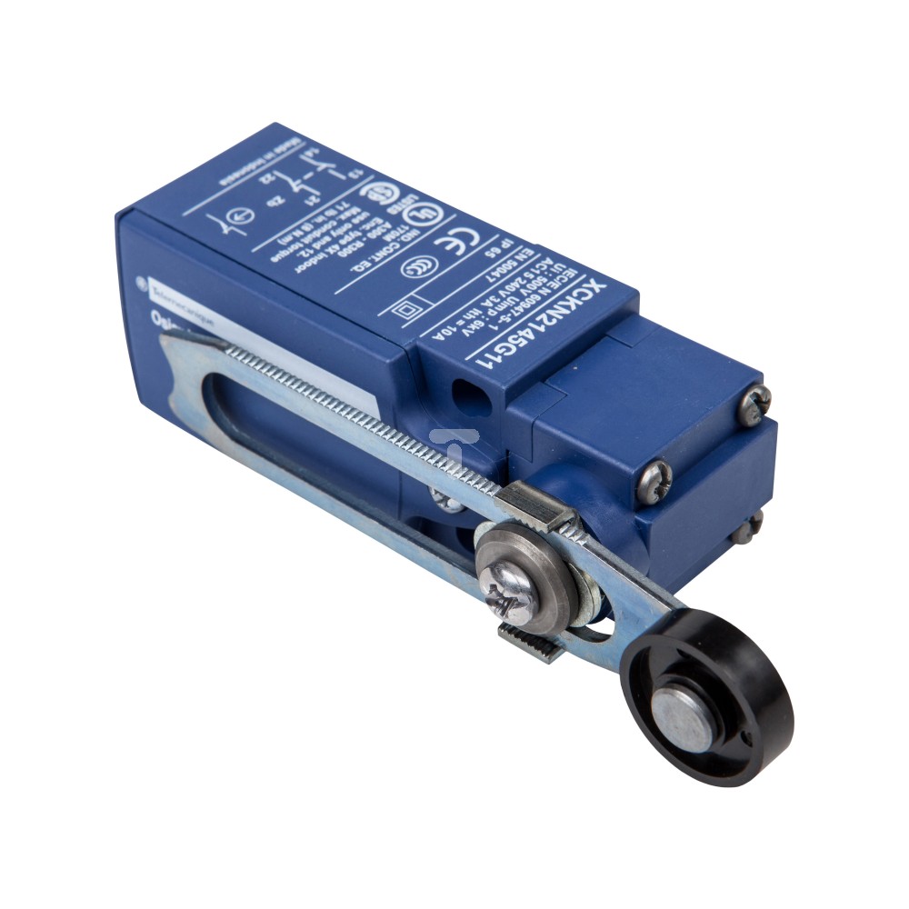 Powyższy wyłącznik krańcowy został wytworzony w serii OsiSense XC. Urządzenie posiada dźwignię obrotową z regulacją długości. Wyprodukowano go z tworzywa sztucznego w kształcie prostopadłościanu. Wyłącznik posiada po jednym styku zwiernym i jednym rozwiernym. Wbudowano również styk migowy. Długość czujnika wynosi 30 mm, szerokość również 30 mm, a wysokość 65 mm. IP65, mówi iż aparat może być używany na zewnątrz w warunkach trudnych, takich jak deszcz, śnieg itp. Do obwodu urządzenie podłączymy poprzez przepust kablowy PG. Temperatura otoczenia w warunkach roboczych znajduje się w zakresie od -25°C do 70°C. Znamionowy prąd pracy dla AC-15 i napięcia 230 V wynosi 3 A, natomiast dla DC-13 i napięcia 230 V - 0,1 A. Firma SCHNEIDER jest znana od pokoleń. W XX wieku zaczęła proces dywersyfikacji kierując się na rynek zarządzania energią elektryczną i automatyki. Dziś jest jednym z liderów, który zapewnia całościowe rozwiązania łączące oprogramowanie, komunikację i usługi.