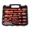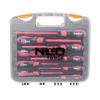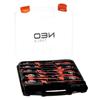 Zestaw wkrętaków renomowanej marki NEO to niezbędny komplet wśród narzędzi każdego majsterkowicza i profesjonalisty. Wkrętaki NEO posiadają certyfikat TUV gwarantujący, iż spełniają najwyższe standardy bezpieczeństwa. Narzędzia wykonane ze stali chromowo-wanadowej S2 posiadają dwukomponentową rękojeść, ułatwiającą pracę, nawet w trudnych warunkach. Izolacja rękojeści wytrzymała jest do napięcia 1000 V. Wkrętaki przeznaczone są do pracy przy instalacji elektrycznej. W skład zestawu wchodzi 9 wkrętaków o końcówkach płaskich 3 x 100 mm, 4 x 100 mm, 5,5 x 125 m, 6,5 x 150 mm, 8 x 175 mm i krzyżowych: PH0 x 60 mm, PH1 x 80 mm, PH 2 x 100 mm, PH3 x 150 mm?. Zestaw mieści się w praktycznej walizce transportowej z tworzywa sztucznego. Wkrętaki NEO to lekkie i wytrzymałe narzędzia, które doskonale sprawdzą się podczas wszelkich prac remontowych i budowlanych. Marka NEO należąca do znanego koncernu TOPEX spotkała się z uznaniem klientów, którzy od lat doceniają zalety jej najwyższej jakości narzędzi i akcesoriów.